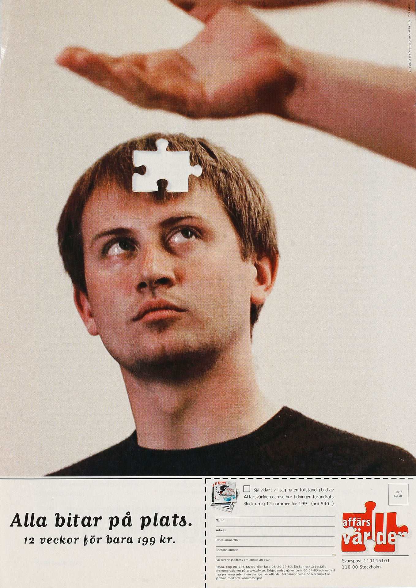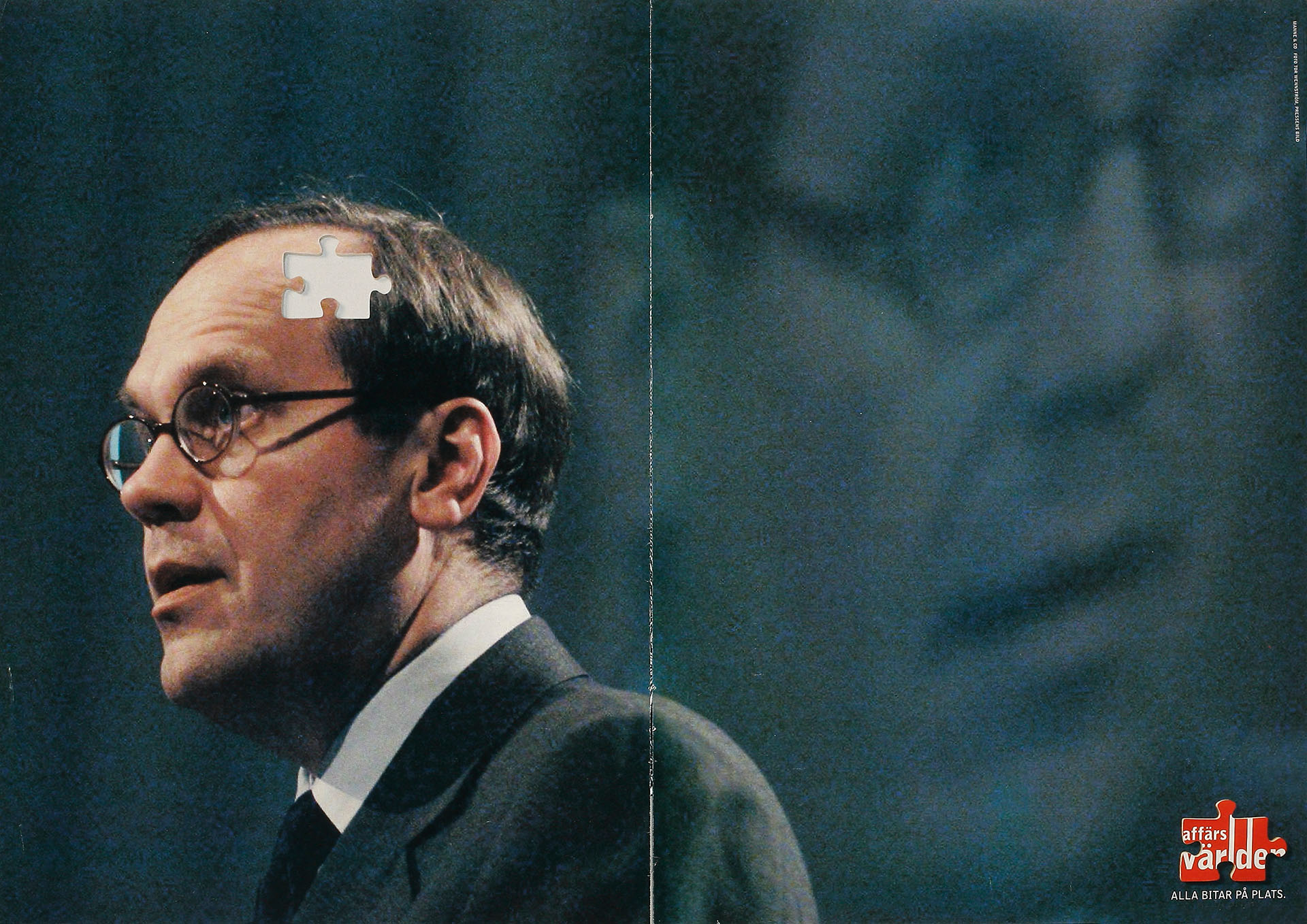 Med konceptet ”Alla bitar på plats”, där Affärsvärldens logotyp var omgjord till en pusselbit, gjorde vi ett stort antal helsidor i dagspress och magasin.