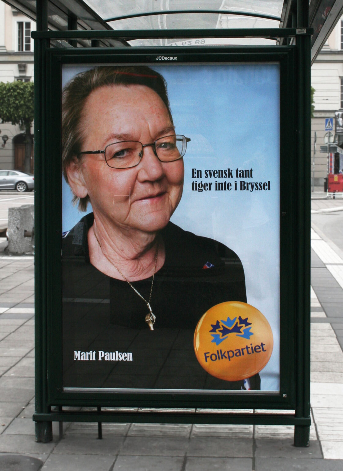 Inför EU-valskampanjen bestämde vi att gå helt och fullt in på Marit Paulsen, Folkpartiets huvudkandidat. Marit var en minst sagt en skön och jordnära person. Med en stark grund i sin ideologi klädde hon sina politiska ståndpunkter på ett enkelt och äkta sätt, ofta också med ett stänk av humor mitt i allvaret. Konceptet blev ”En svensk tant tiger inte Bryssel”, som gick på stortavlor, annonser och valaffischer runt om i Sverige.