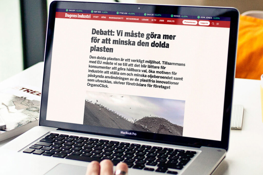 De flesta vet inte att produkter såsom våtservetter, finare pappersservetter, pappersbordsdukar, te- och snuspåsar innehåller plast. Plast som kan ersättas med OrganoClicks biobaserade innovationer. Jag skapade begreppet ”dold plast”, som blev en del i formuleringen av vår affärside, samt som vi bland annat använde i debattartikeln ”Minska den dolda plasten”, vilken publicerades i DI och Aktuell Hållbarhet.