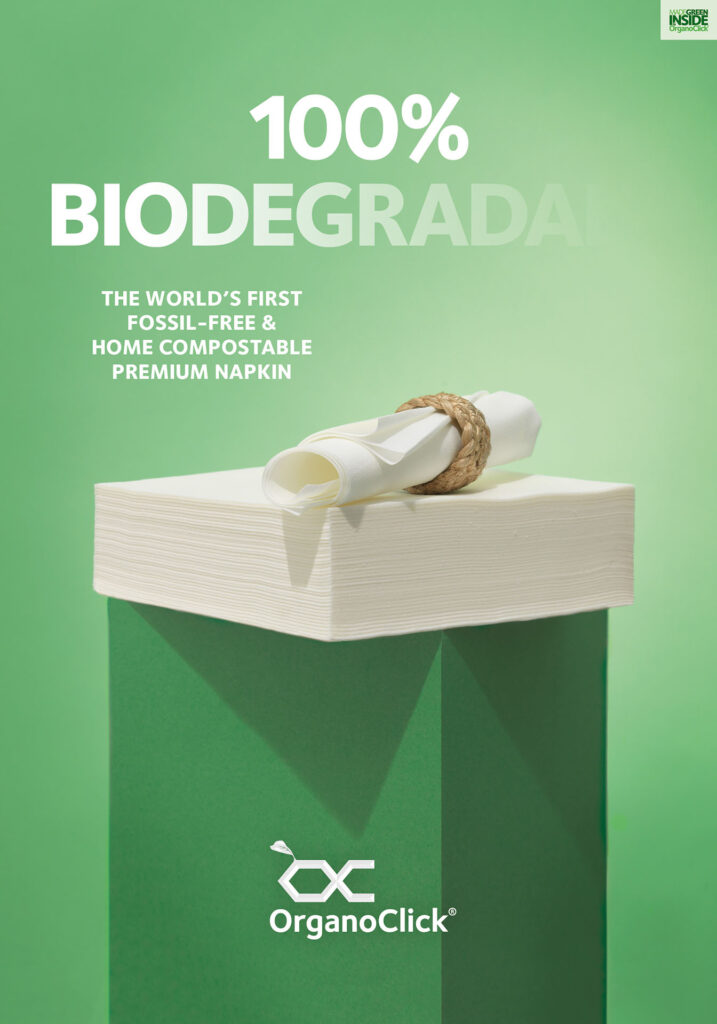 Ovan är märket applicerat på världens första fossilfria premiumservett avsedd för restaurangbranschen. Ja, servetter av den här typen innehåller alltid plast. Tills nu alltså.
