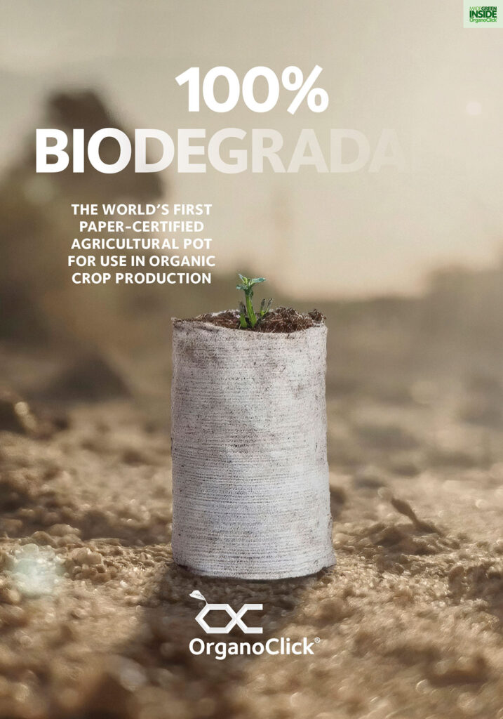 Ovan exempel på kommunikationsenheter i samband med lansering och PR för världens första 100 % biologiskt nedbrytbara premiumservett respektive odlingskruka. Båda är 100 % biobaserade tack vare OrgnoClicks unika fossilfria bindemedel för nonwovenmaterial. Foto: Hans-Erik Nygren