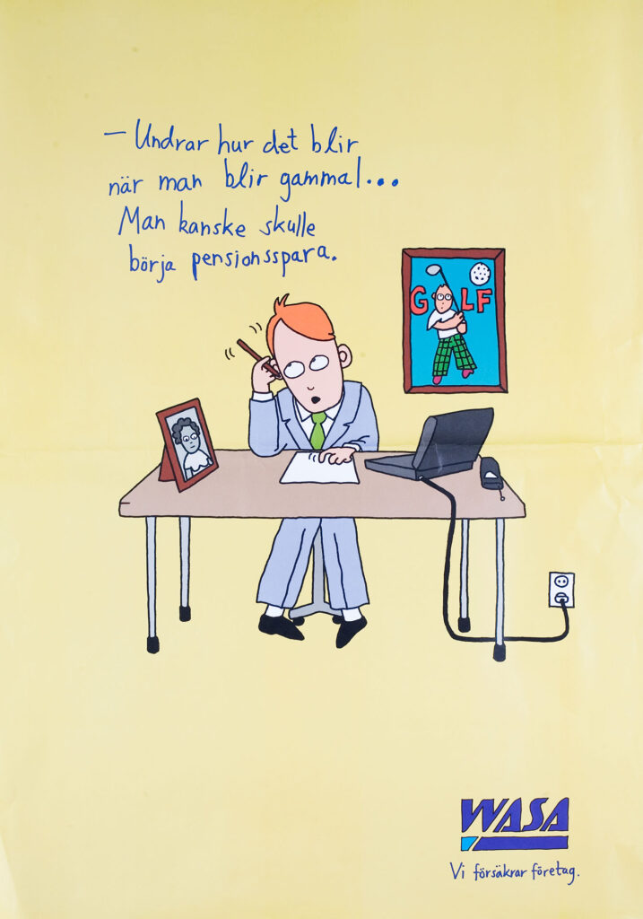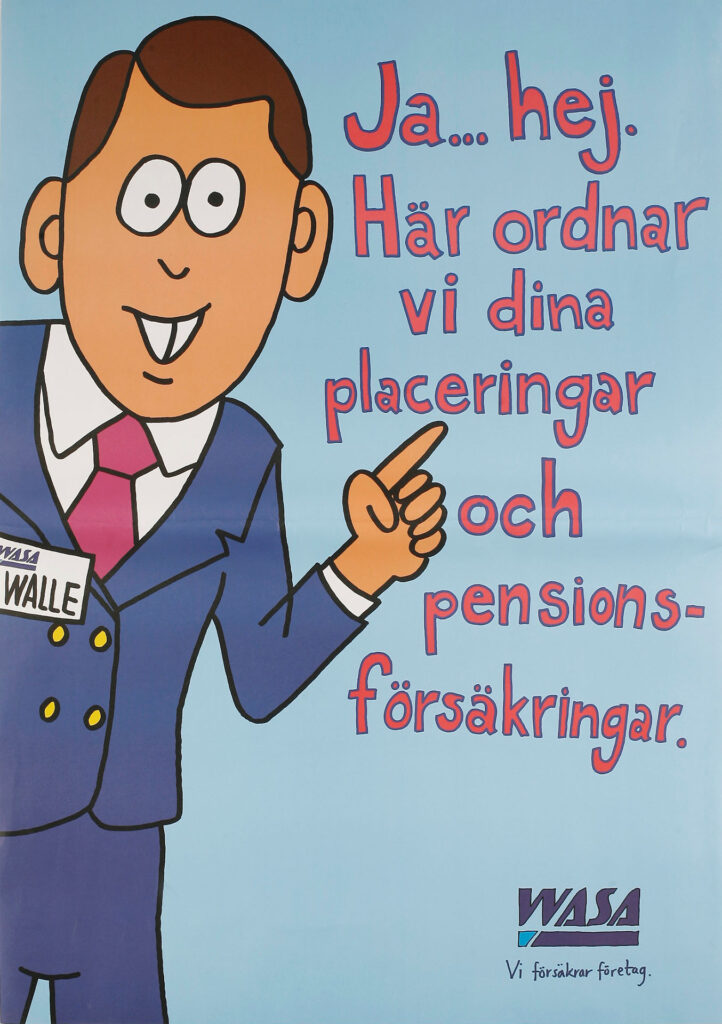 Lösningen blev ett antal filmer tecknade av Magnus Carlsson, känd för bland annat ”Robin” och ”De tre vännerna och Jerry”. Tillsammans med Magnus skapade vi karaktären Walle, en sympatisk men lite försiktig försäkringsmäklare, som blev företagets talesperson. Rösten gjorde skådespelaren Gösta Ekman! ”Ja, hej …” blev Walles omisskännliga entré i alla filmer.
